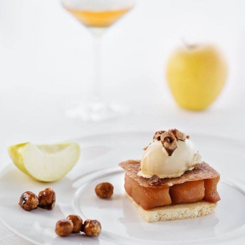 arrange tre slices of apple between 2 tuiles, serve with ice cream and candied hezelnuts.