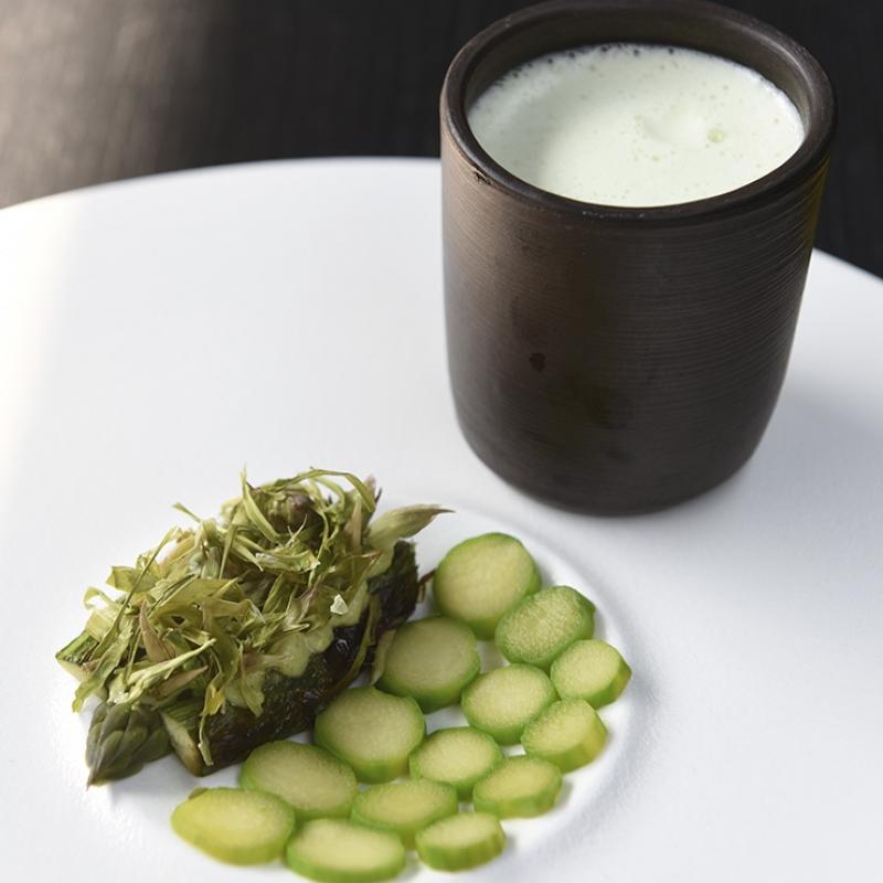 On one side of the base of a plate, place the circular-cut asparagus, on the other the asparagus emulsion; on the latter place the blanched and roast asparagus; top off with dots of emulsion and crispy asparagus pieces.