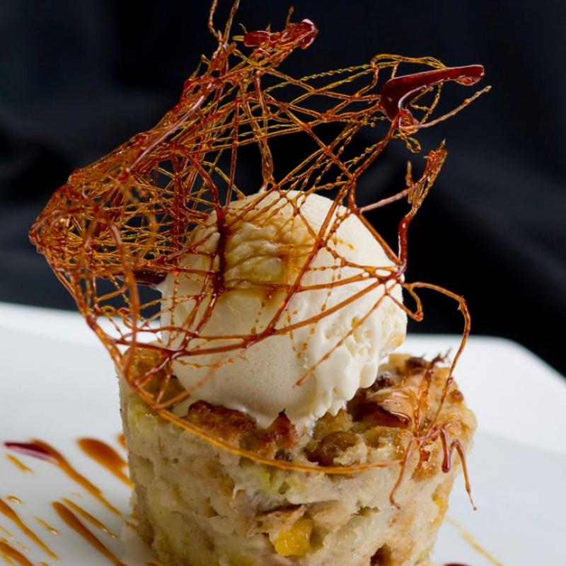Banana Rum Raisin Bread Pudding topped with Ponch De Crème Ice Cream and Caramel Sauce
