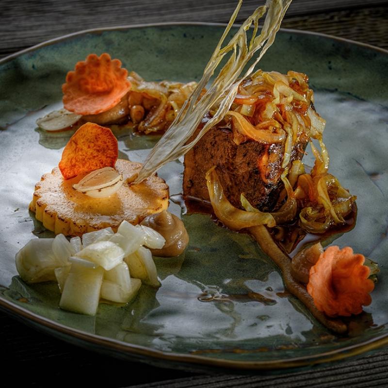From the spices make a group, rub the beef rib, saute the meat and cook for 10 hours at 80 degrees in the oven in a vacuum.