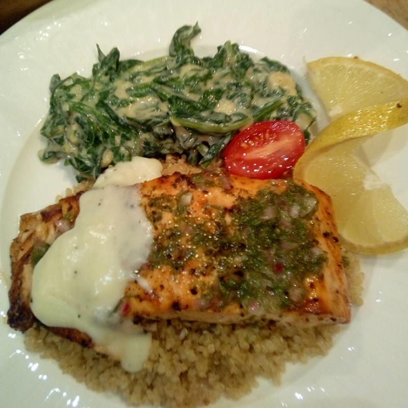 Boiled Salmon with Quinoa, Creamed Spinach and White Chocolate Sauce