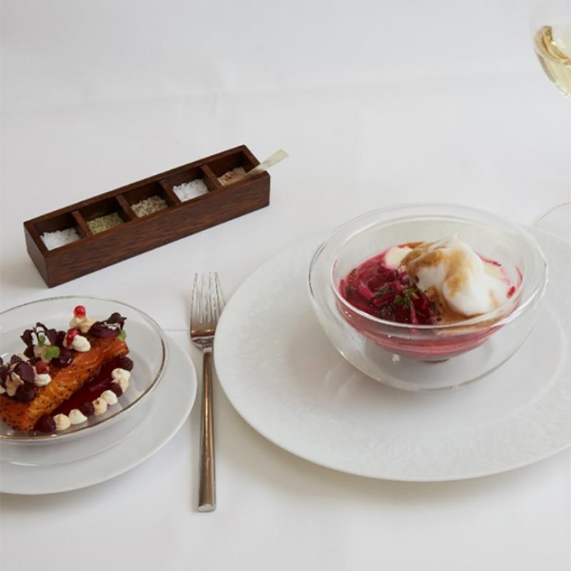 Borscht with fresh cream, Crema di Caffe and smoked salmon
