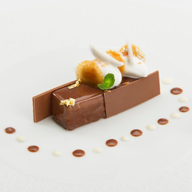 Simmer the cream and egg yolks at 85º C in a pan. Pour over the couverture milk chocolate. Add in the jelly and strain into the frame/mould over the biscuit.