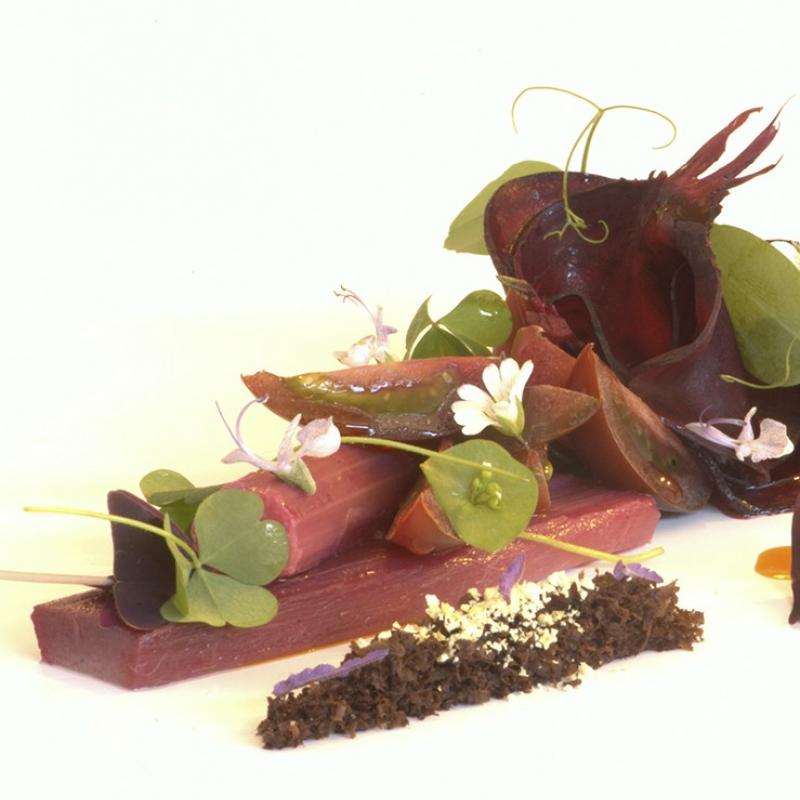 Rhubarb: Peel the rhubarb, seal with a little peanut oil and a knob of butter. Moisten with beet juice, season with salt, pepper and mustard seeds. Cook gently ensuring the stalks do not deform.