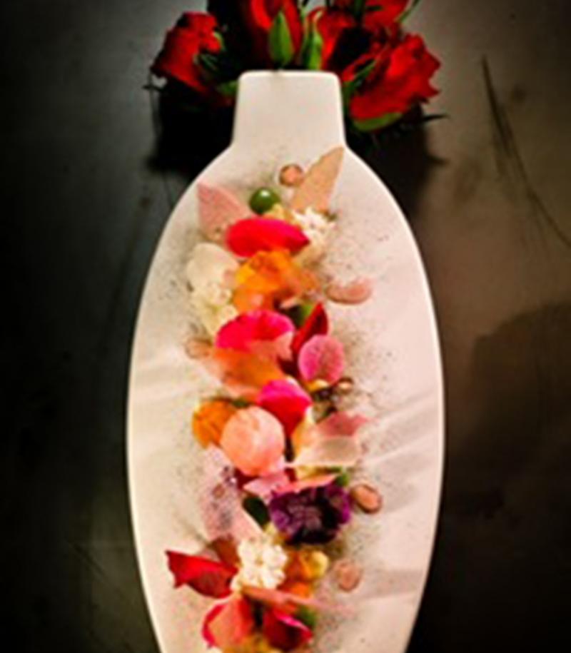 Accompaniment: Red clover leaves, vinaigrette, miner´s lettuce, sheep´s sorrel, wild flowers and Kaffir lime salt.