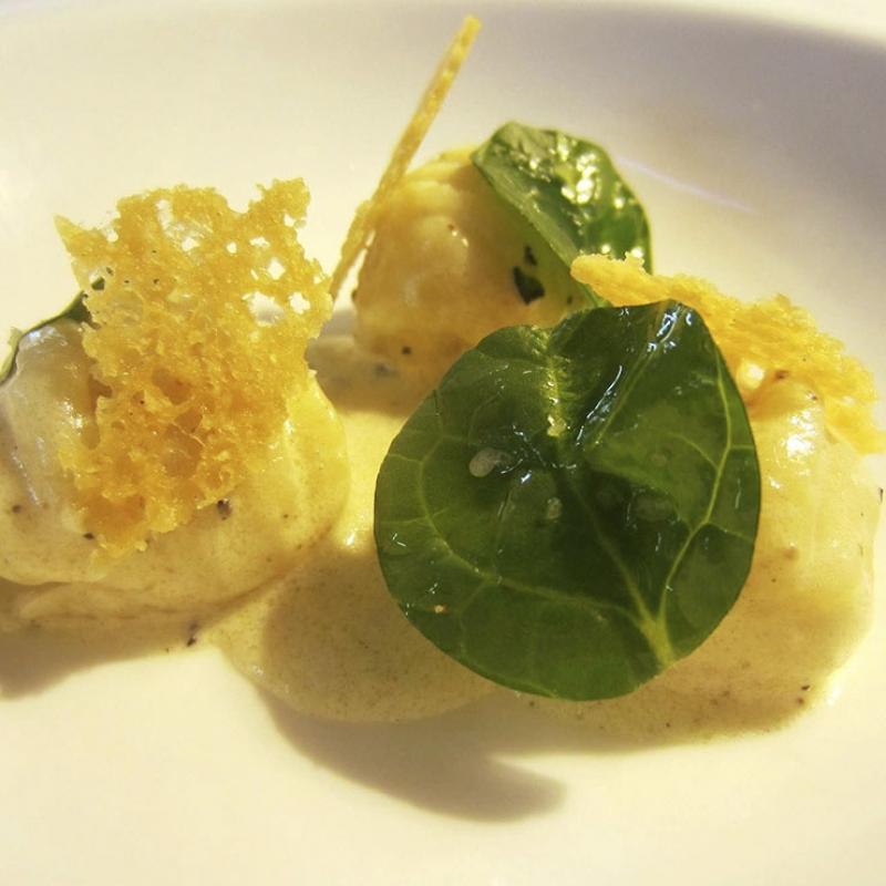 Breadfruit Gnocchi, Parmigiano Reggiano Cream Spinach shoot salad