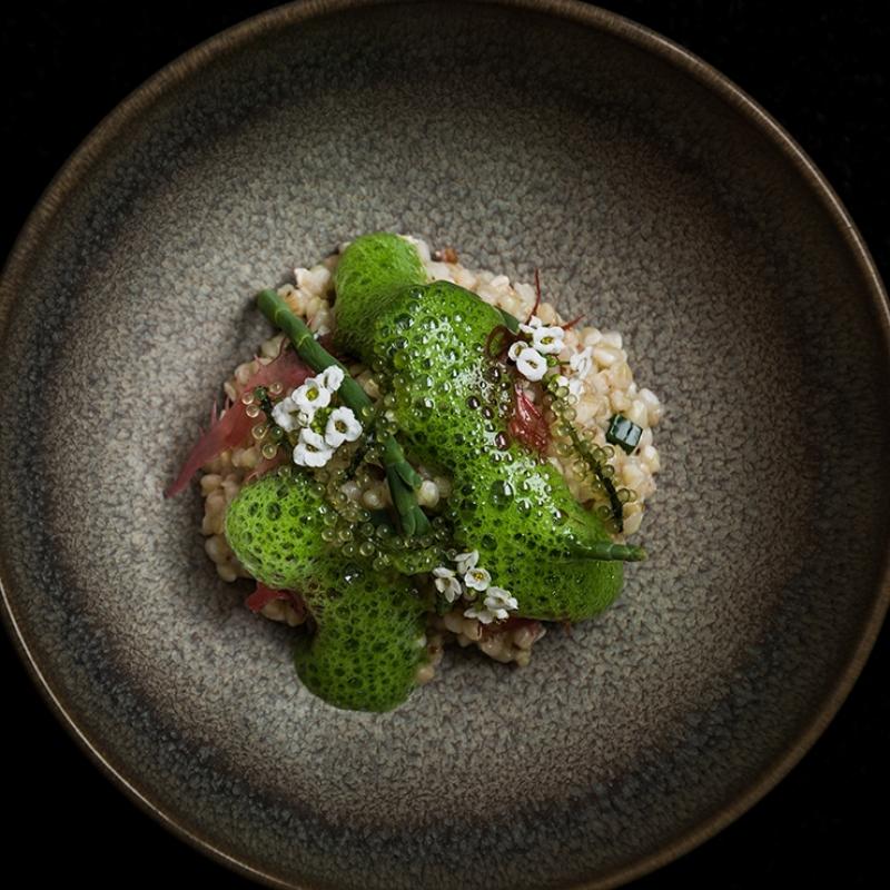 Place the buckwheat in a bowl and garnish with the spinach jelly and if you like some edible coastal greens