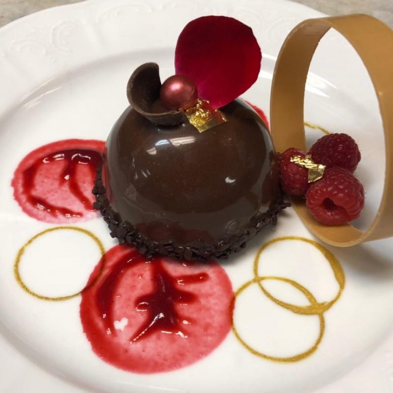 - Press one square into the center of the chocolate mousse dome before capping with a roulade disk.