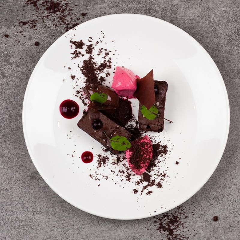 Chocolate brownie, beetroot mousse, cherry gel, chocolate sorbet, crumb