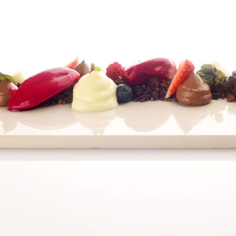 Chocolate earth with raspberry ice cream, white foam chocolate, chocolate mousse and fruits