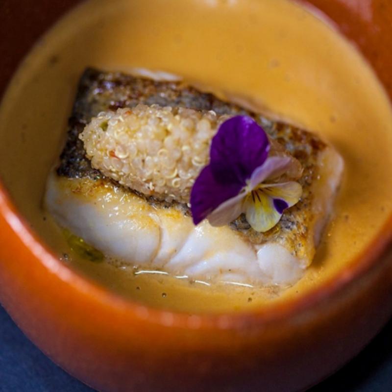 Sauté the vegetables with a little butter, then fry the quinoa for a couple of minutes. Add in the fumet and cook for about 15 minutes. Take off the flame and leave to cool a little. Add a little butter, diced chives and coriander.
