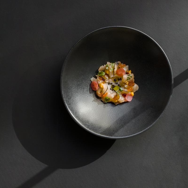 Slice the trout as thin as possible and arrange in a bowl, forming a wreath. Pour the emulsion into the center and decorate with drops of the canola oil. Decorate with trout roe, wholegrain mustard, mandarin marmalade, cooked lentils, marinated daikon and chervil.