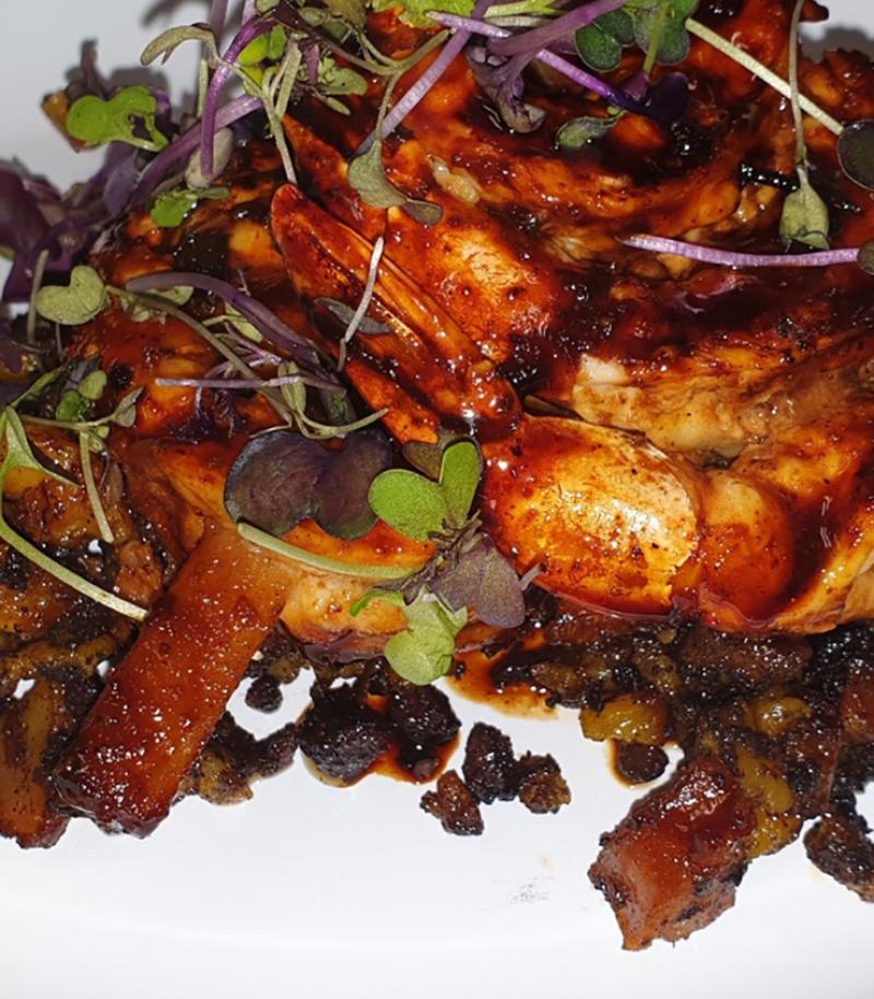 - Place on the top of rest of the ingredients. Finish with truffle dressing, presenting slices on the top. All should be light and natural.