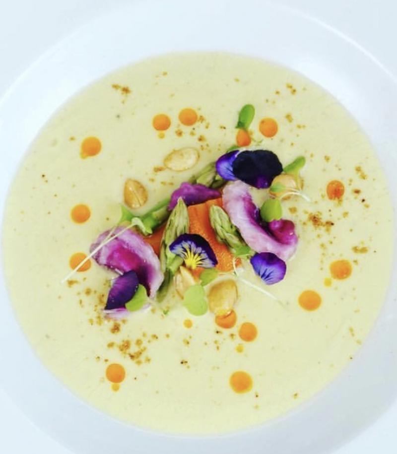 Sweat the fragrant garnish in butter; season. Add the corn to the both and cream; sauté; once cooked, liquidise and finely sieve.