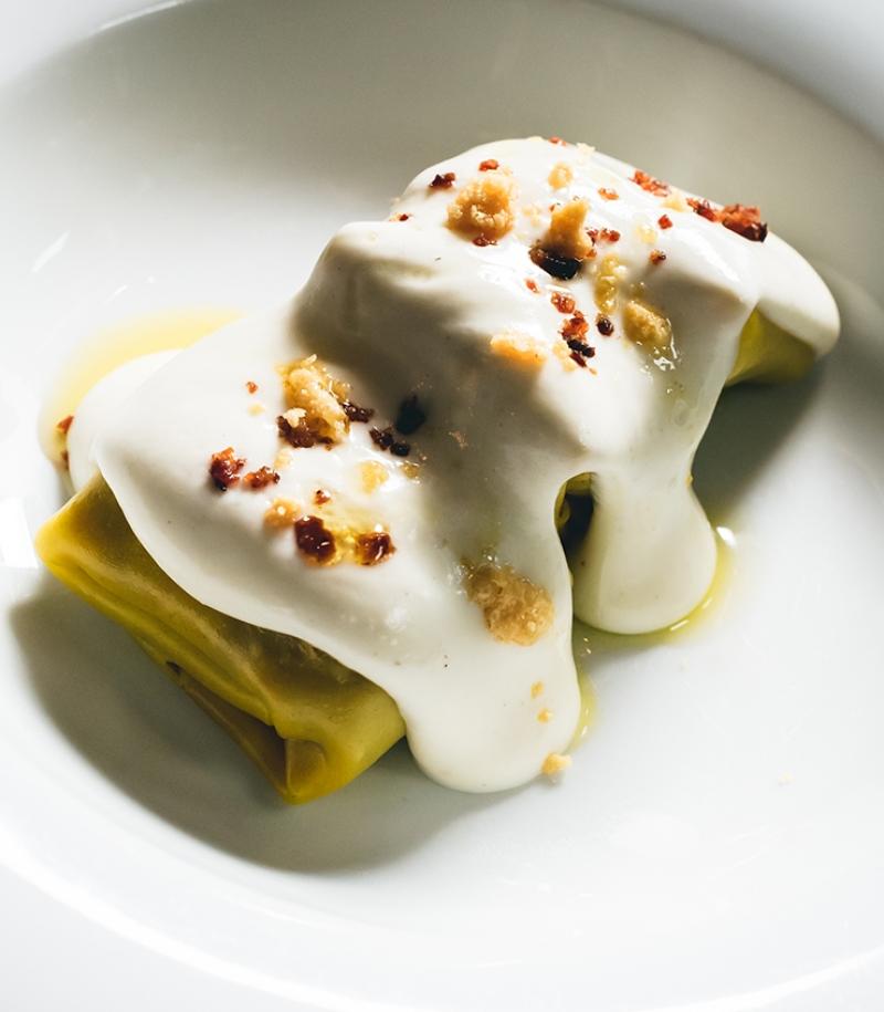 Use as base for the quenelle tamale. Decorate with red cloverleaf and powdered milk.