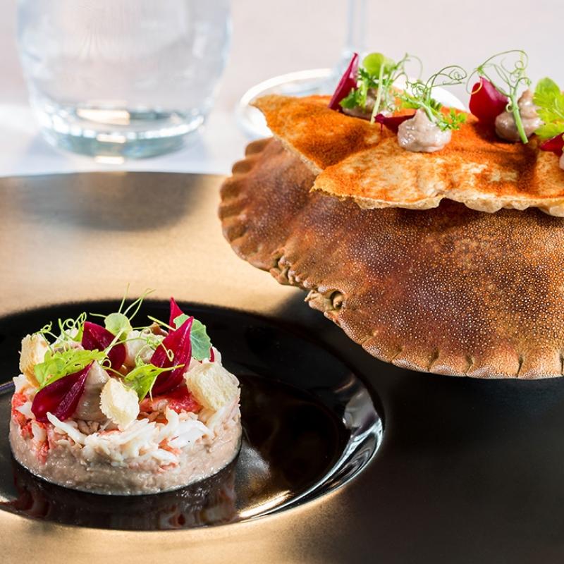 Crab, duck meat pate, bisque cracker, spring onion and sour cherry vinaigrette