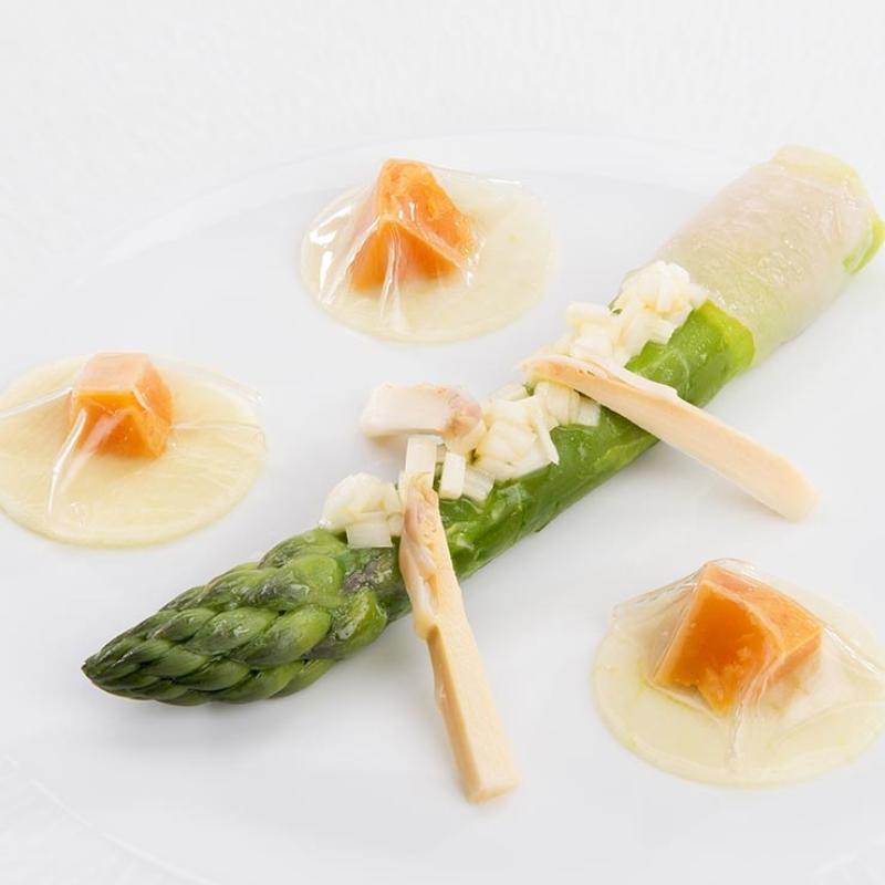 Raw white asparagus – Cut some strips of peeled (use a peeler) white asparagus. Season with salt, pepper, oil and sherry vinegar. Stir. Leave to marinade for 2 hours, then roll up into cylinders.