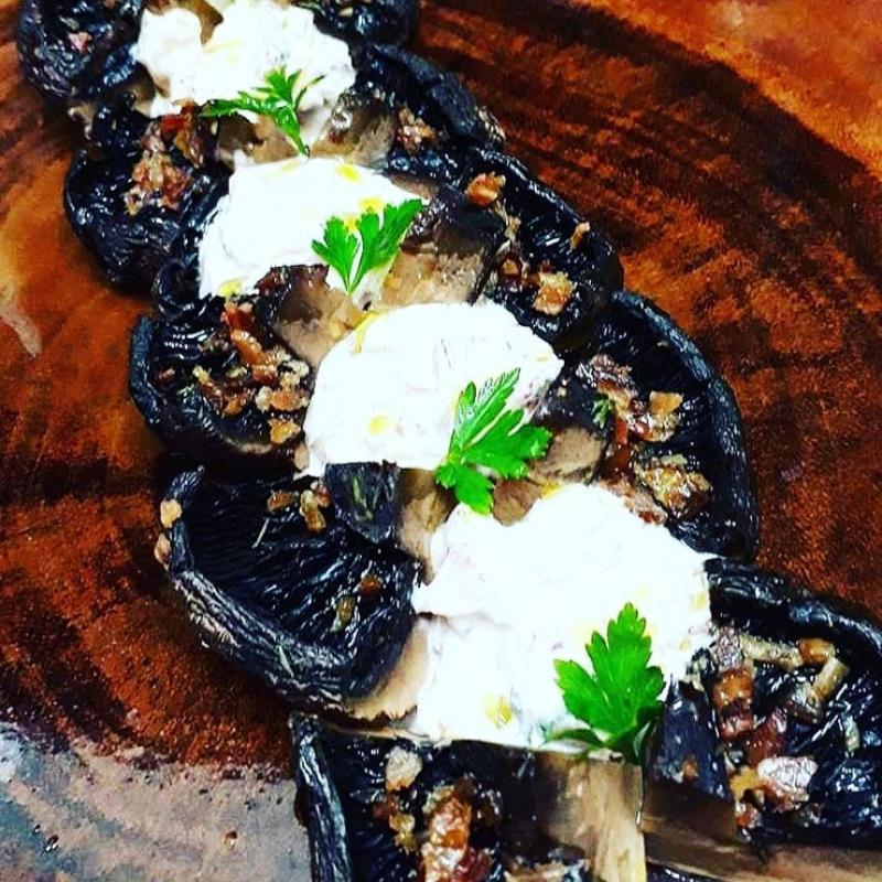 Note: finely slice the herbs together with the onion and bacon. Then, season the select portobello mushrooms and put in the oven at 200 degrees for 10 minutes. Lastly, mix the mascarpone cheese with the lobster meat to add gloss to the mushrooms. Serve the oven-baked portobellos with the herbs.