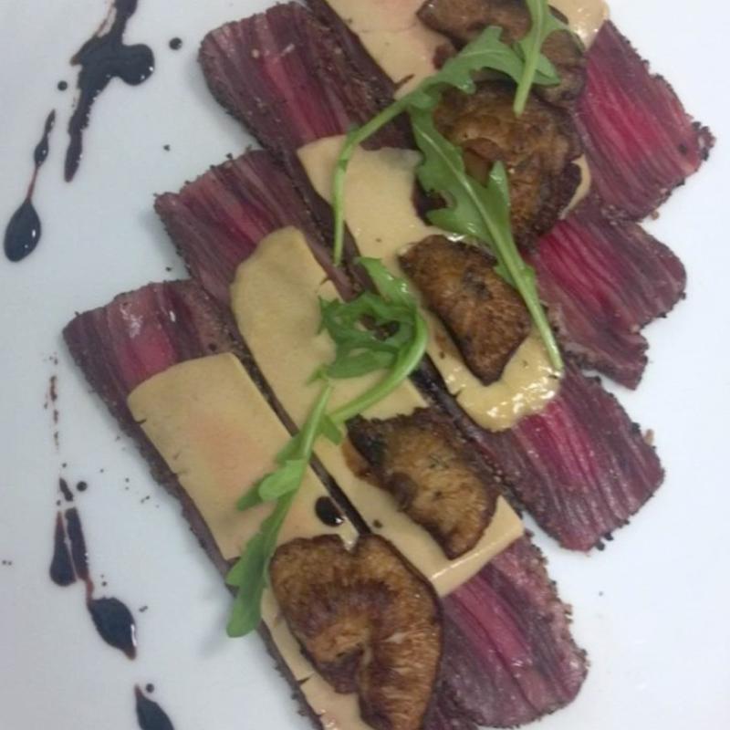 Dish: Wrap 1 piece of cut foie gras and 2 pieces of the sautéed mushrooms with the each slice of the cured spinalis. Place them on the plate, and place a leaf of wild arugula on top of each wrap.
