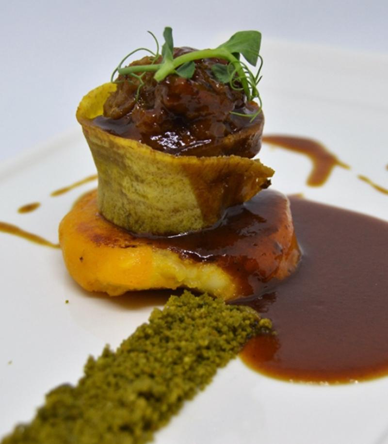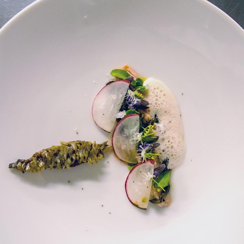 Cured swordfish, fried red snapper skin, onion shoots, marinated chipotle chilli mousse