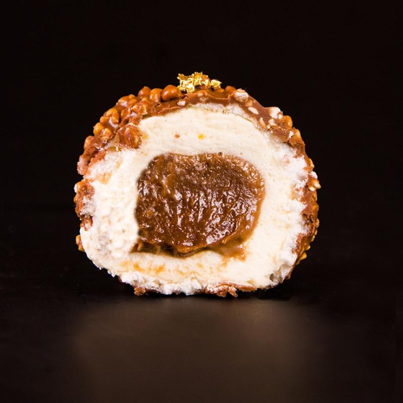 Fill the hemispheres with the mousse. Put the frozen caramel into one half. Connect the halves and freeze. Then cover with the glacage «Gourmt». Decorate with gold.
