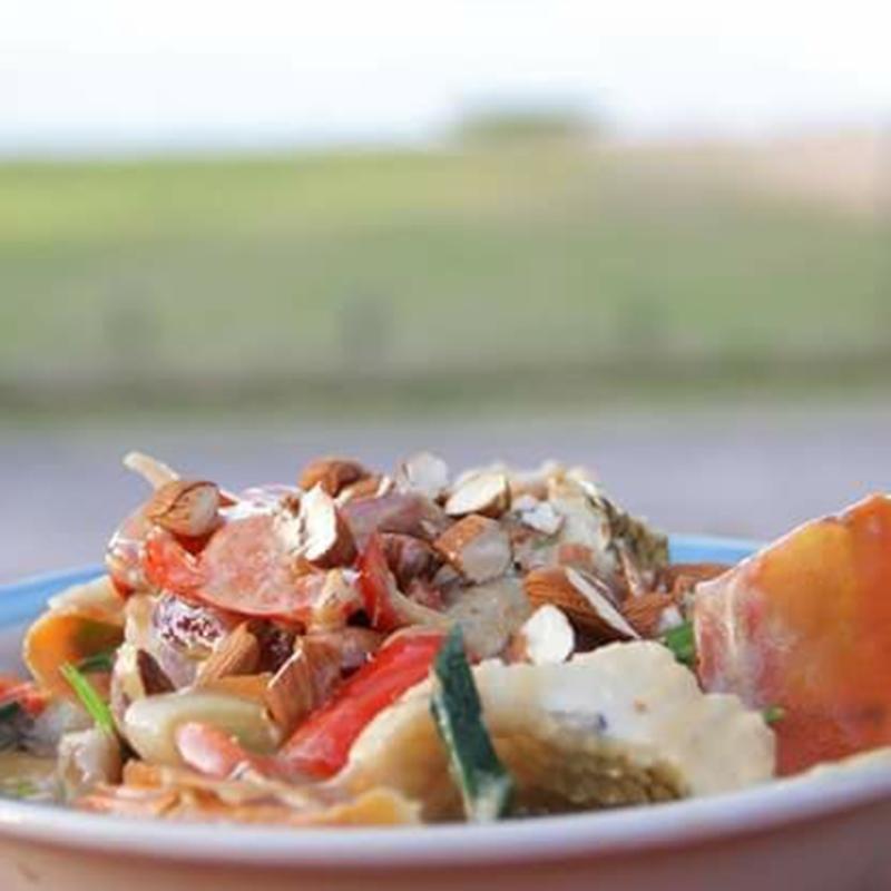 Chop the fish into 3 to 5 cm diameter sections and place in the cooking implement; after 5 minutes, add in the white part of the leek and the coconut milk; sprinkle the serving plate with crushed almonds.