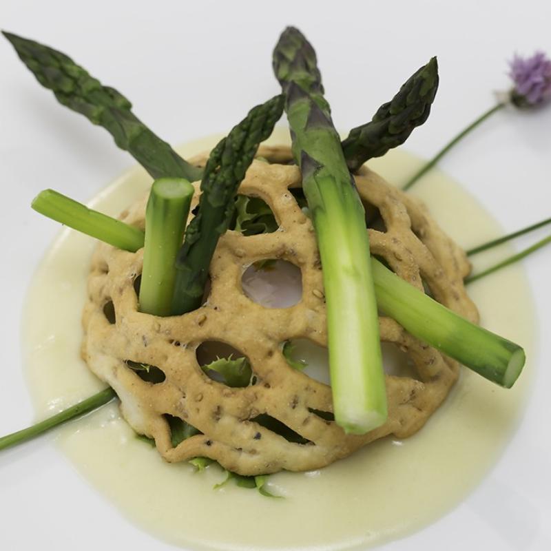 - Put a pasta cupola on the egg and some asparagus cooked in water for 4 minutes.
