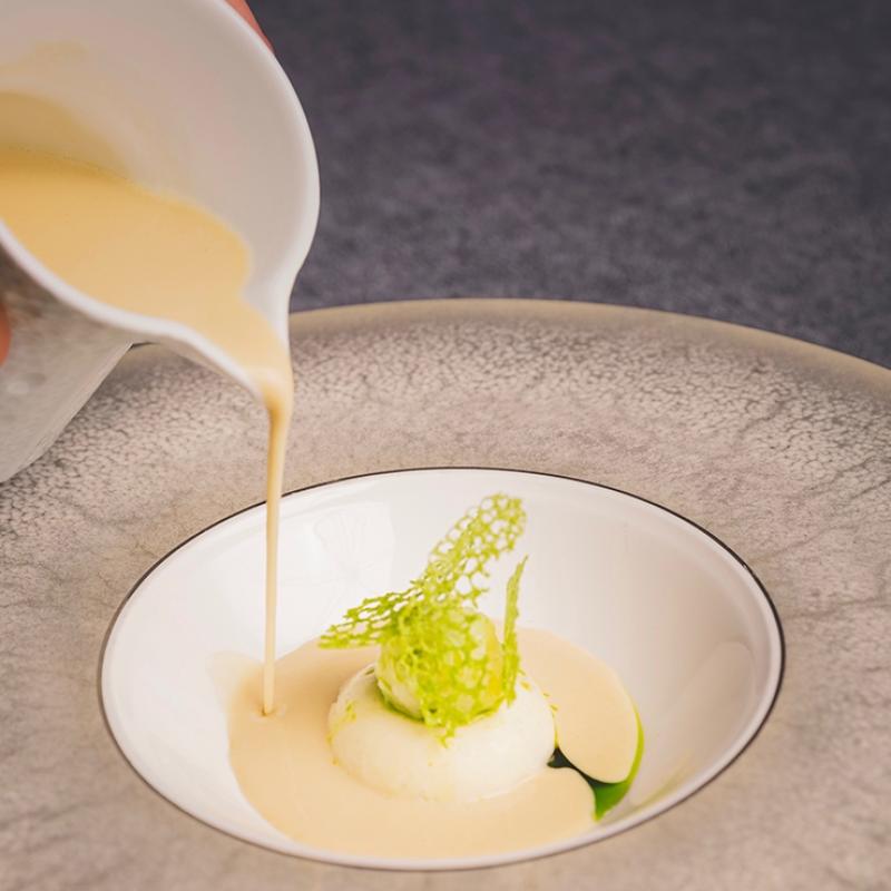 We serve the soup with a fish ball, leek and a tuille. But you can use fish, shellfish and your favorite vegetables.