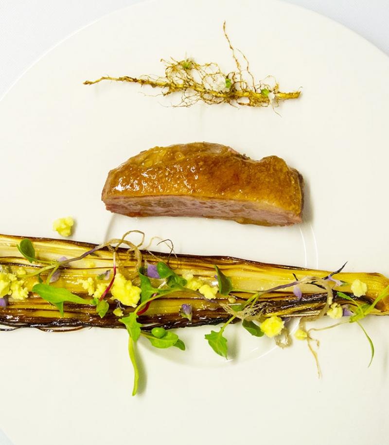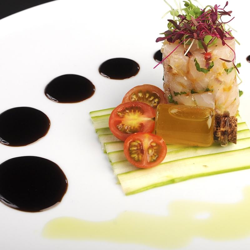 Place all the ingredients for the balsamic vinegar reduction in a saucepan; let them thicken, then add in butter for a glistening effect; season and serve cold.