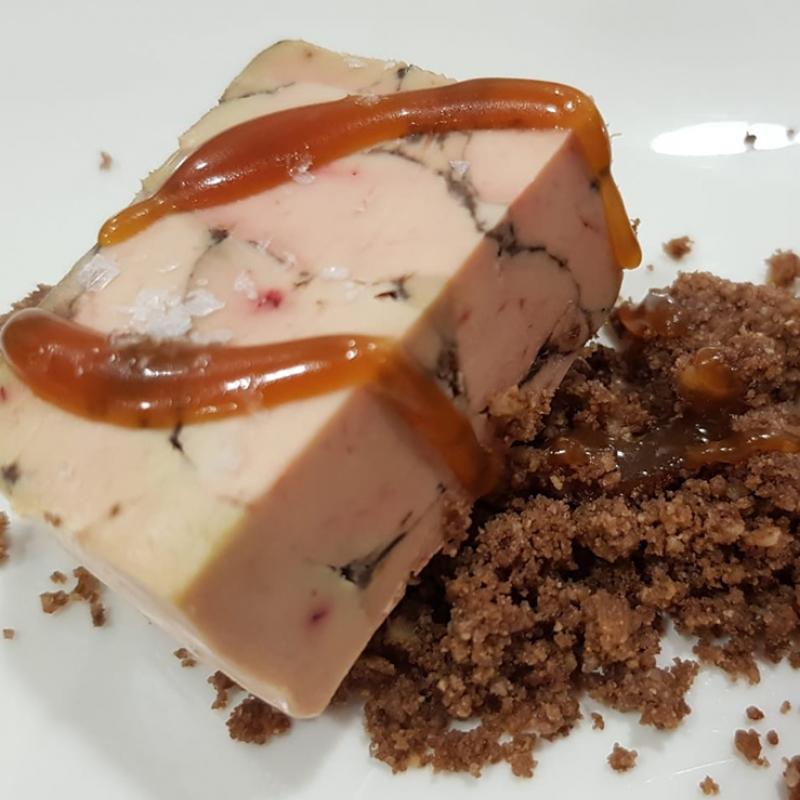 - On a crumble base, place a slice of foie and cocoa before topping off with the toffee.
