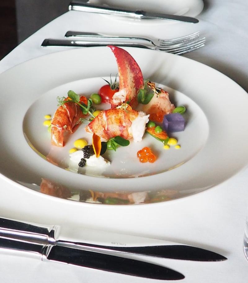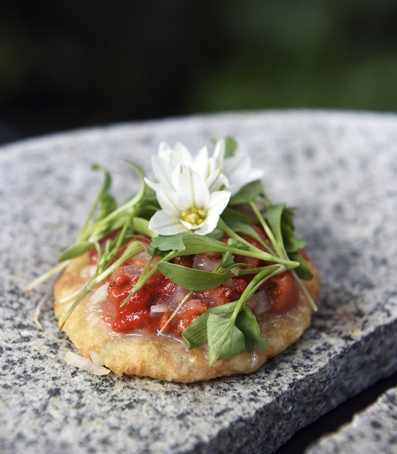 Fried prime rib with sauteed chickpeas and red pepper sauce with Singani and red wine vinegar