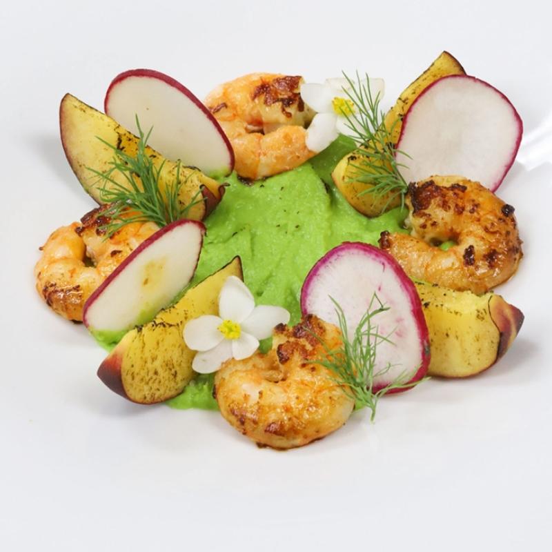 Using a flat plate, place some purée in the centre and surround it with 4 shrimps placed equidistantly, 4 slices of peach in the gaps created; also add in the sliced radish and the dill.