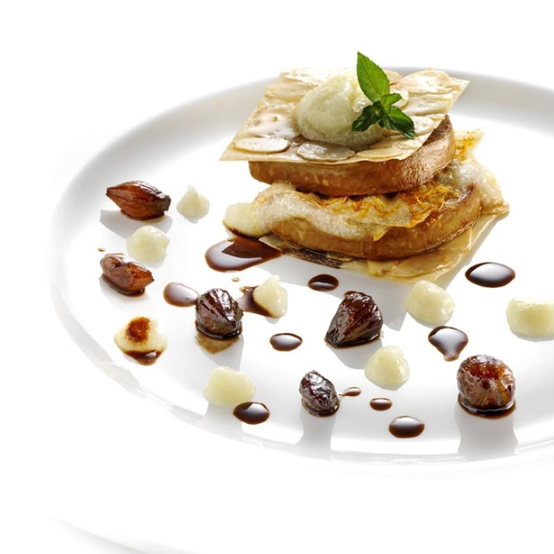 - Place a slice of the liver on the plate then a layer of the almond pastry then the pear puree. Follow with another slice of liver a square of orange pastry, puree, liver and more puree. Spoon the shallot sauce around the gateau.