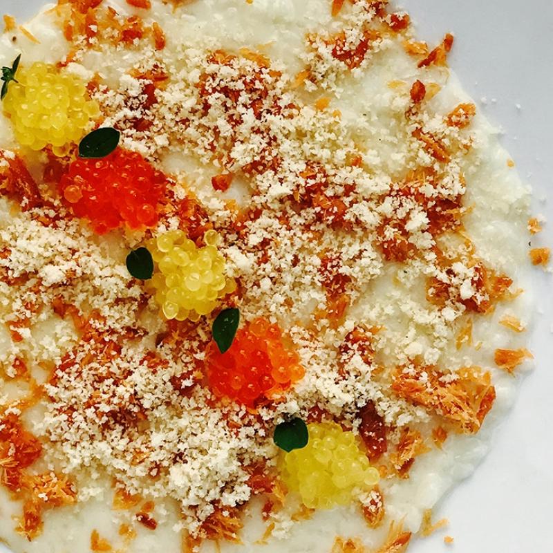 Ginger Risotto With Salmon Crumble, Macadamia Nuts And Eggs