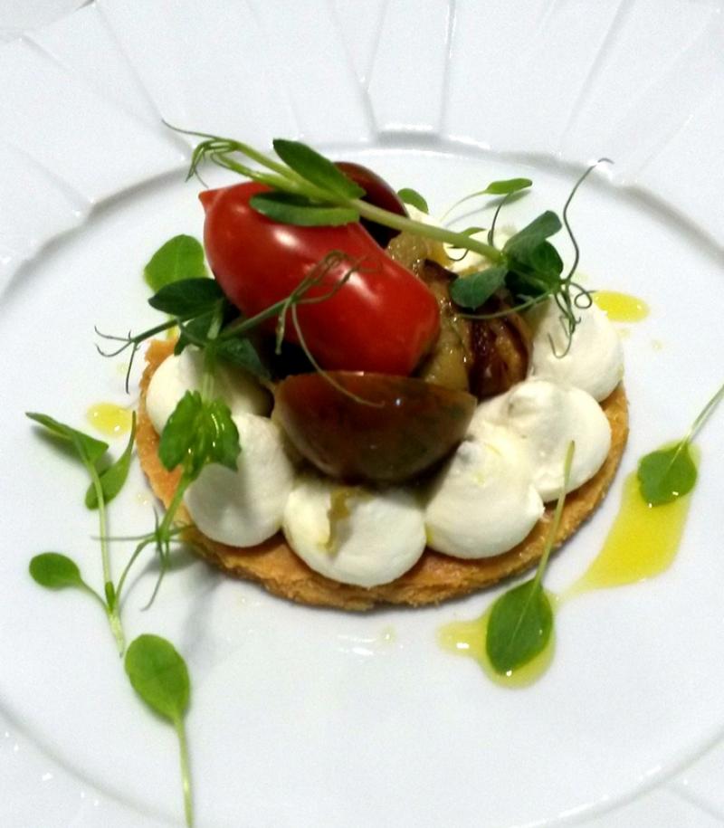 Garnish the surface with salmon crumble, grated macadamia nut, fresh marjoram leaves, salmon and arctic char eggs.