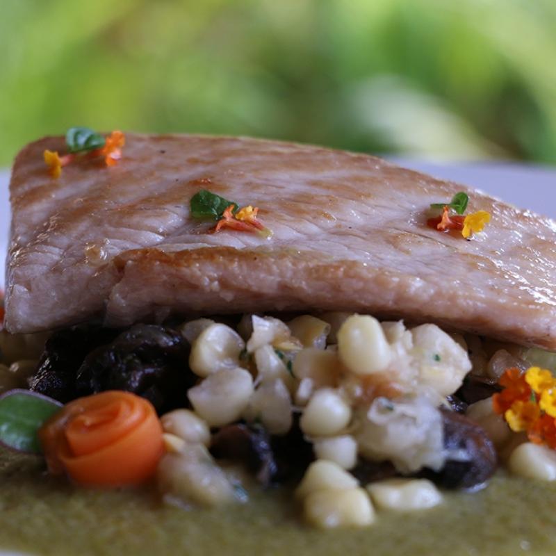 Grilled fish with green poblano mole & esquites and cuitlacoche