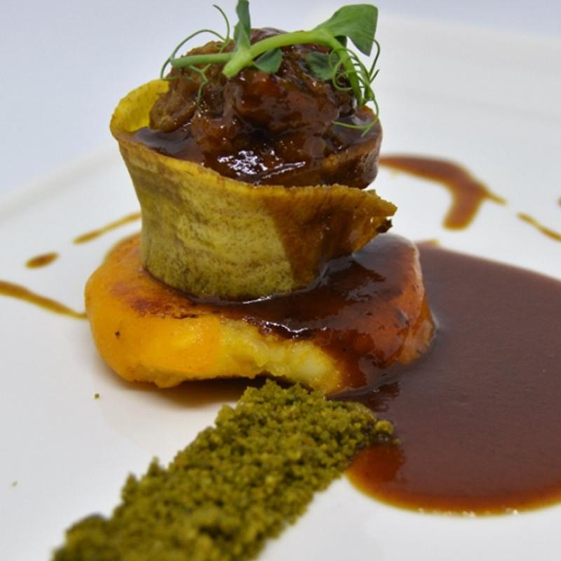 Heat the potato in the oven for a few minutes. Make a thick stripe of 'salprieta' on a plate, add the potato and top off with the plantain mould. Fill with meat and sauce and it's ready to eat!