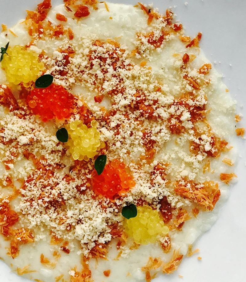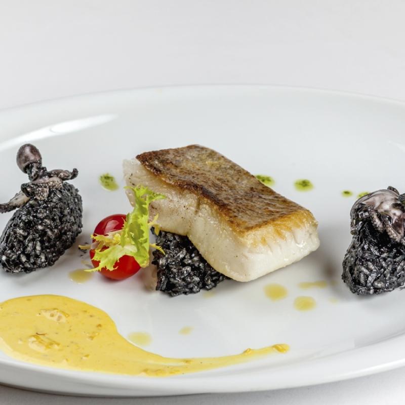 Halibut, fried to a perfect crisp... Melting risotto with cuttlefish ink and young octopus... Exquisite lemon-saffron sauce... This is a holiday and a celebration of the Italian cuisine flavour.