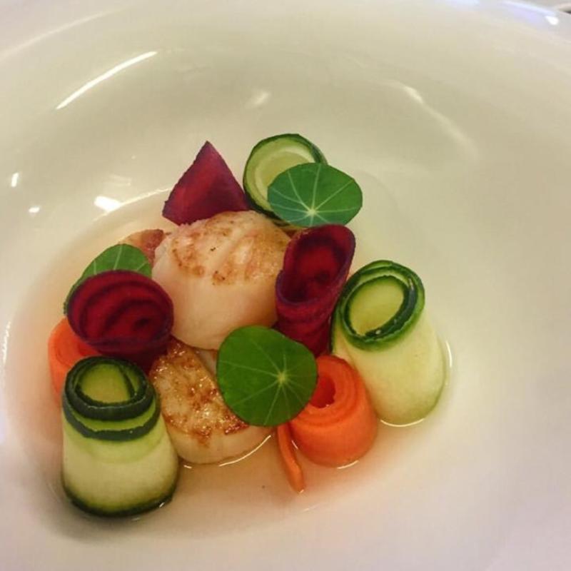 Herb-coated bass, cauliflower puree & lemon froth