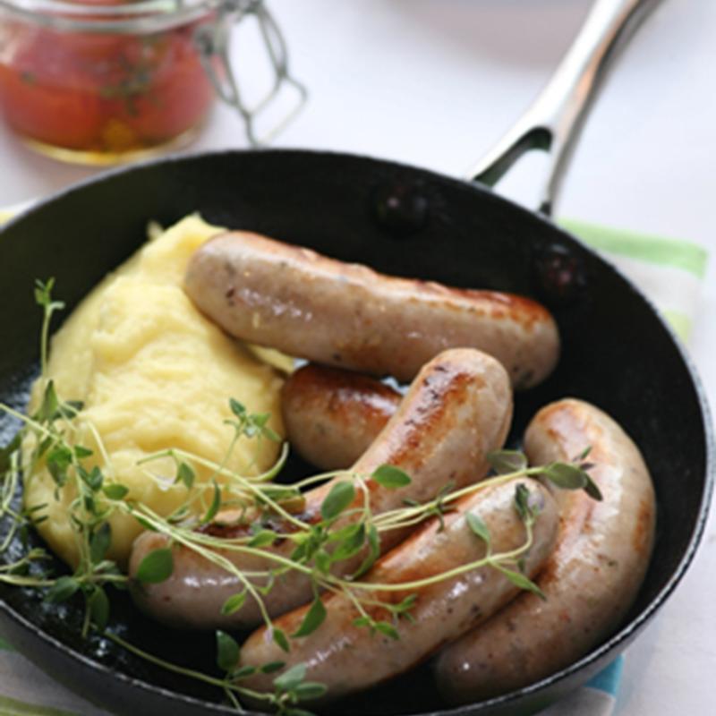 Homemade lamb sausages with mashed potatoes and cherry tomatoes