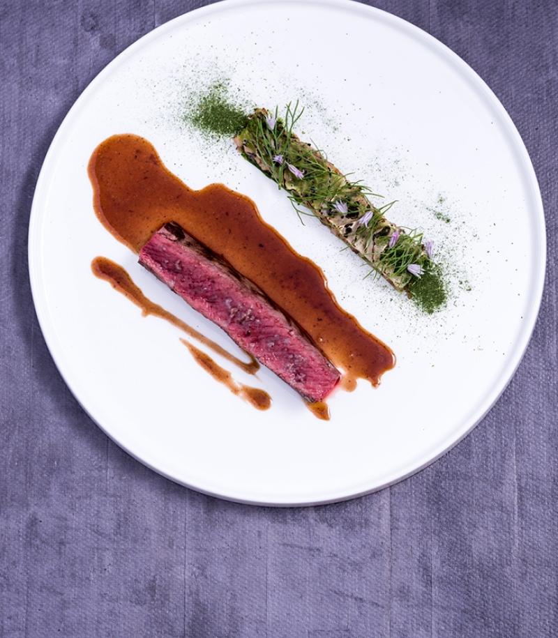 - Place a piece of meat on top and cover with sauce, decorate with the Parmesan and a few drops of pesto.