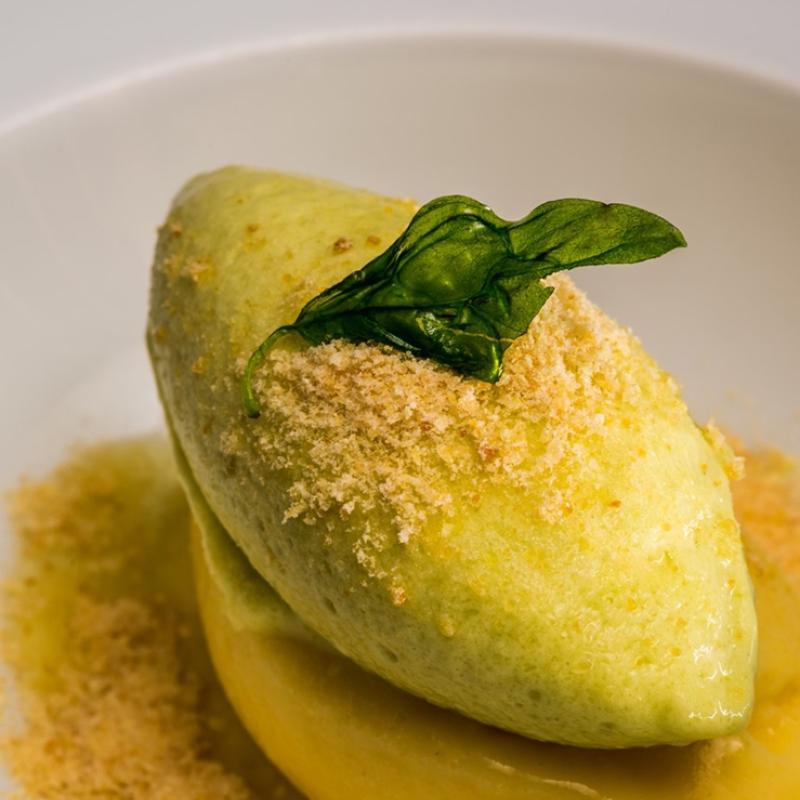 - Place a quenelle of sweetcorn ice cream in a deep dish.
