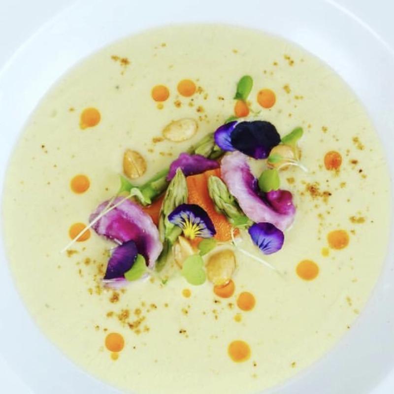 Infused coconut milk soup, roasted peanuts, pickled vegetables and plantain crisps