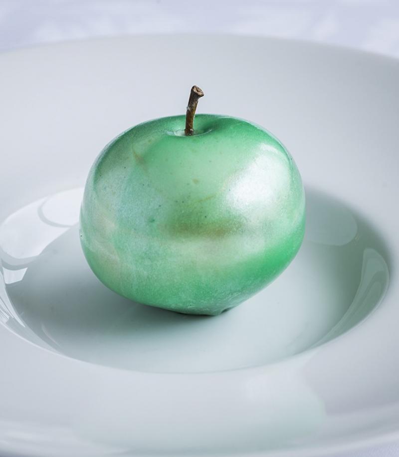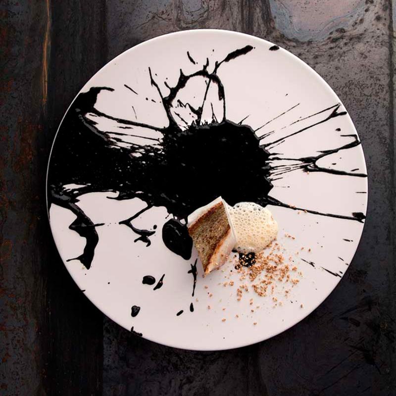 Using a soup spoon (and small quantities), spread a dash of ink purée across a large white dish.