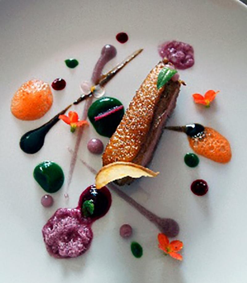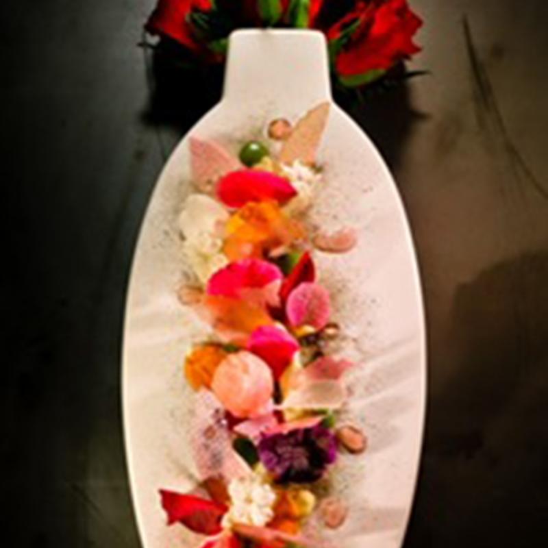 Present the honey & thyme ice cream on a cold plate; decorate the meringue with the flowers & the crystallised rose flower; cover everything with a scoop of rose and violet ice cream; carefully drizzle a little lavender syrup over the preparation.