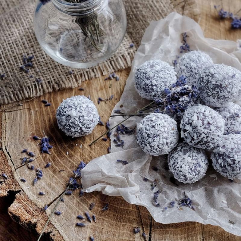 4. Form the lavender mixture into candies, and dip into the freeze dried berry powder and grated coconut.