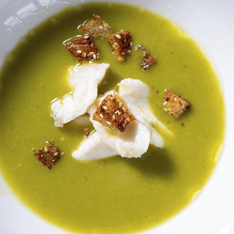 Leek soup with seabass