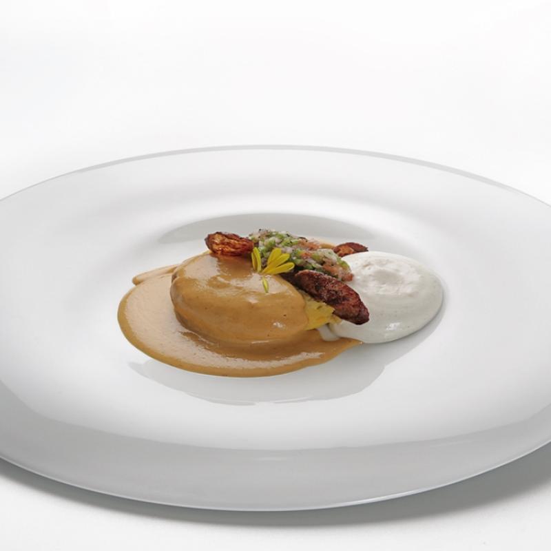Llapingacho potato cake, peanut paste, crispy criollo chorizo, criollo diced veg and egg & truffle foam