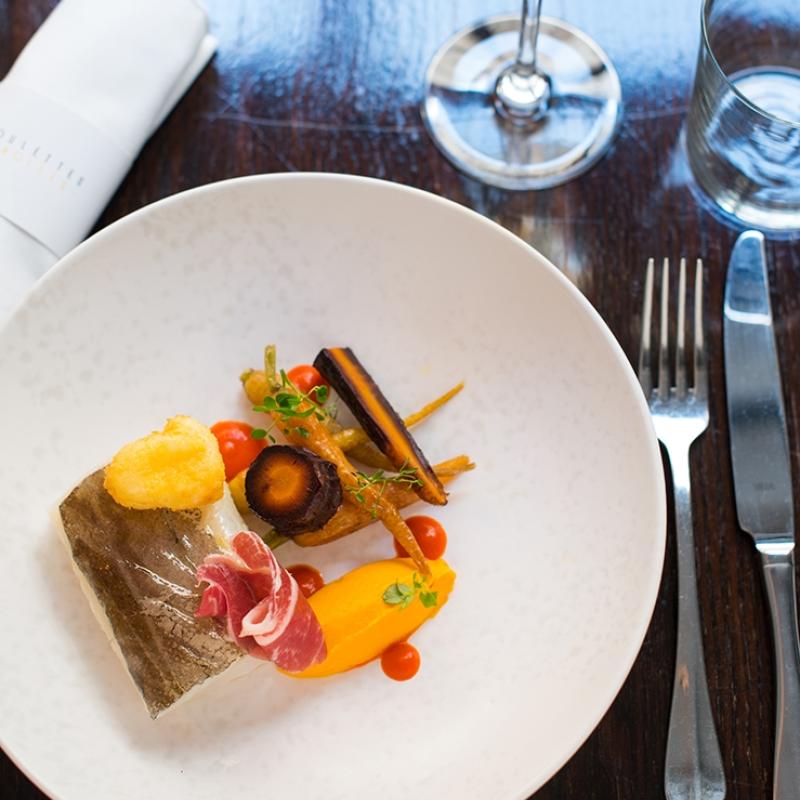 Loin of cod, cream of carrot with cumin and brown butter, roast purple carrot and “pata negra”