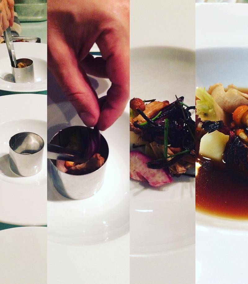 Plate the breadcrumbs on the bottom of a small bowl/ plate; set egg on top, mushrooms and asparagus tops next to the egg, green bean jus to garnish on the side.